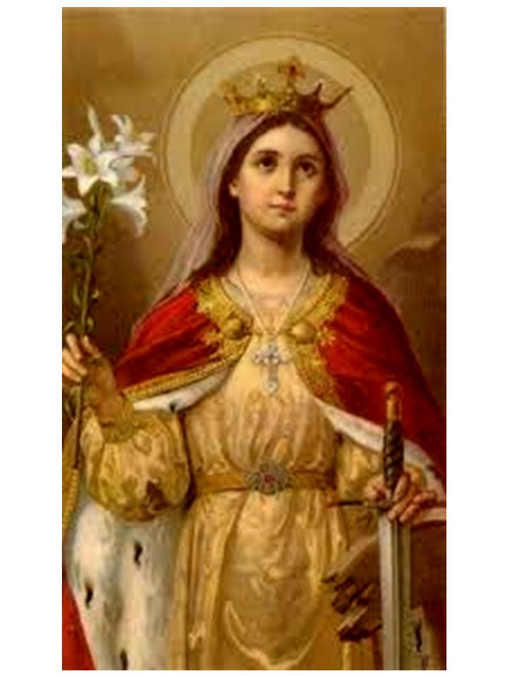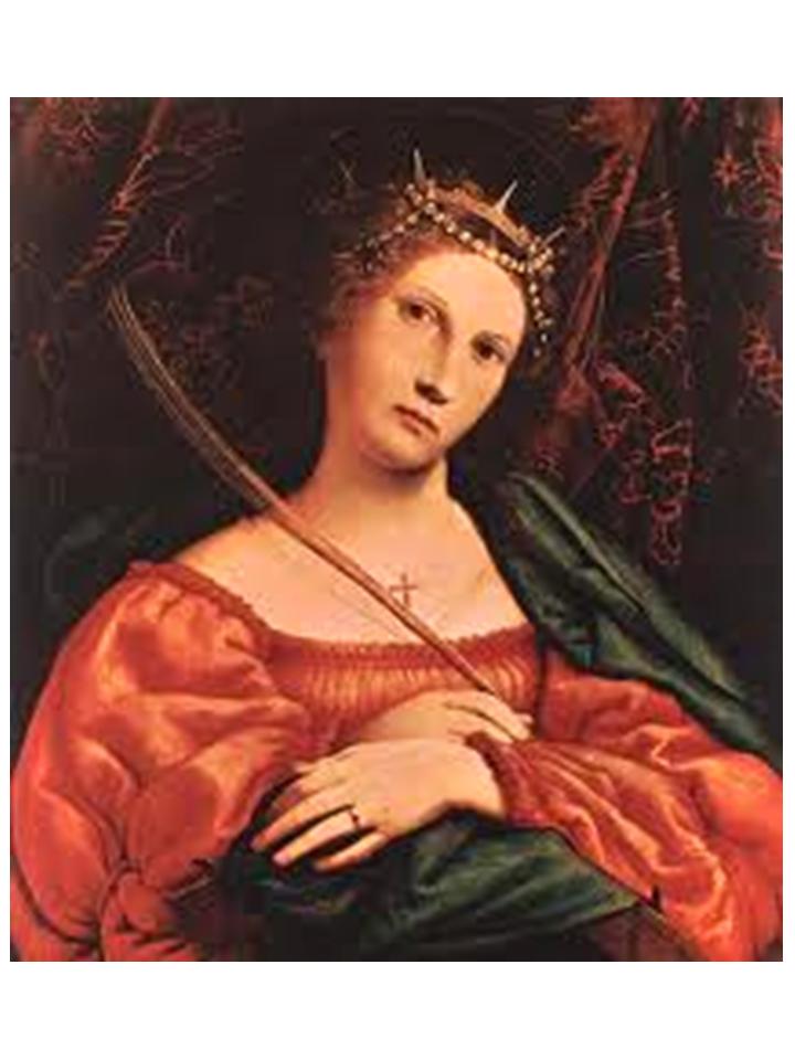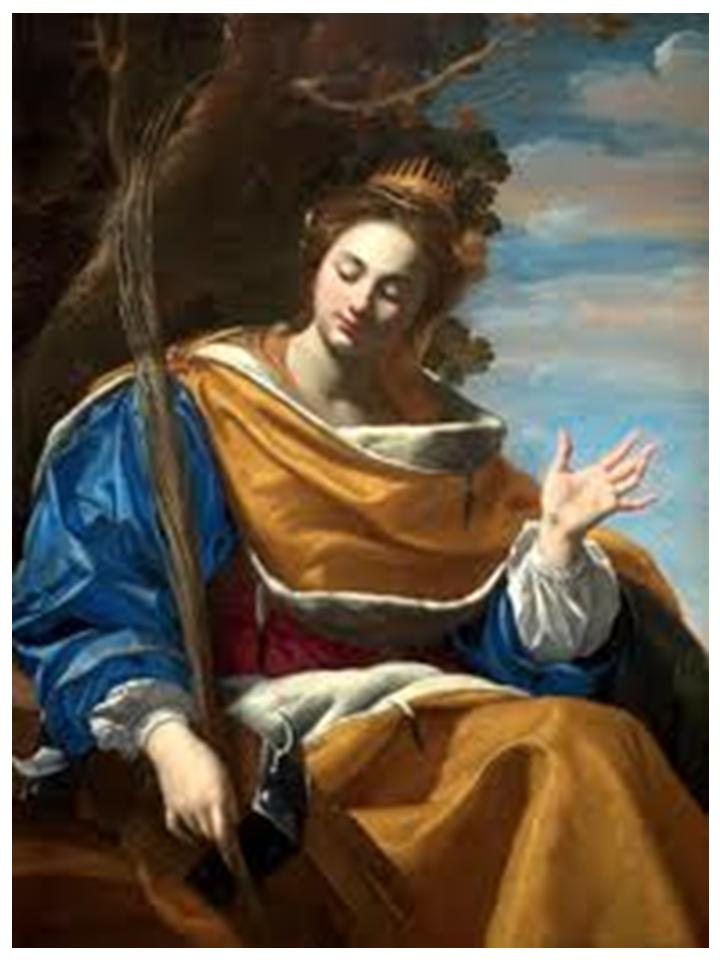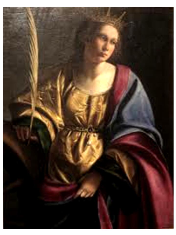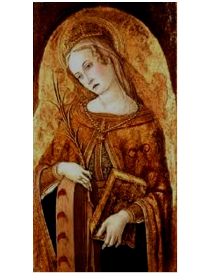 Many of our formerly Catholic Churches (they are now meeting halls for the vatican-2 heretic cult) were named after her; her statue, with the broken wheel as identifying symbol, was found in many Churches. Some of the greatest artists painted her likeness and the events of her life. Because of her wisdom in disputation, theologians invoked her aid. Churchmen sang and preached her praise. Many prayed to her because of the graces she obtained for them through the Blessed Virgin. See Section 48 regarding intercessory prayer.