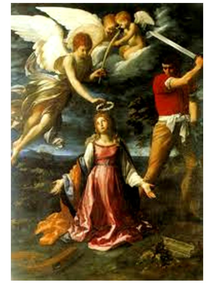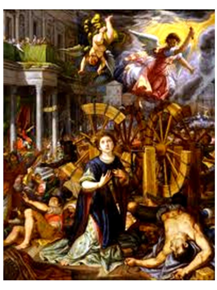 But angels are said to have thrown bolts of lightning so that the wheel broke and the spikes flew off, injuring onlookers but leaving Catherine unharmed ... so the ruler had her beheaded. When she was eventually beheaded, milk, not blood, flowed from her neck, then ...