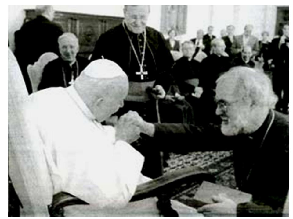 Left to right:   (1) Non-Catholic apostate Karol Wojtyla (a.k.a. "john paul 2") working for the damnation of the "anglican" heretics by greeting their "leader" Rowan Williams with approval,  (2) Working for the damnation of un-baptized pagans who call themselves jews,  (3) Again working for the damnation of the jews at their satantic "wailing wall" -- Wojtyla demonically making an advertisement that the Old Testament foreshadowing of the Catholic Church is not over,  (4) Kissing the "koran" working for the eternal damnation of the pictured mohammedan.