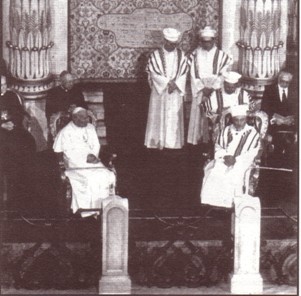 Inside the synagogue of Satan, automatically ex-communicated "john paul 2" bows his head to be attentive to the words of an un-baptized pagan ("rabbi" Toaff). (Photo, Le Monde des Religions, November-December 2005)